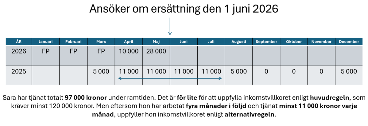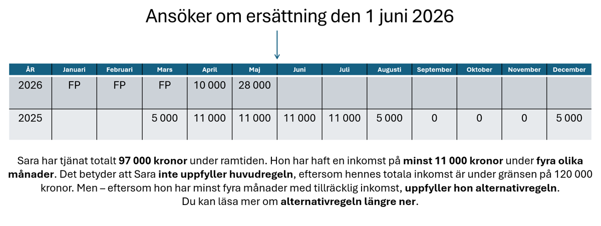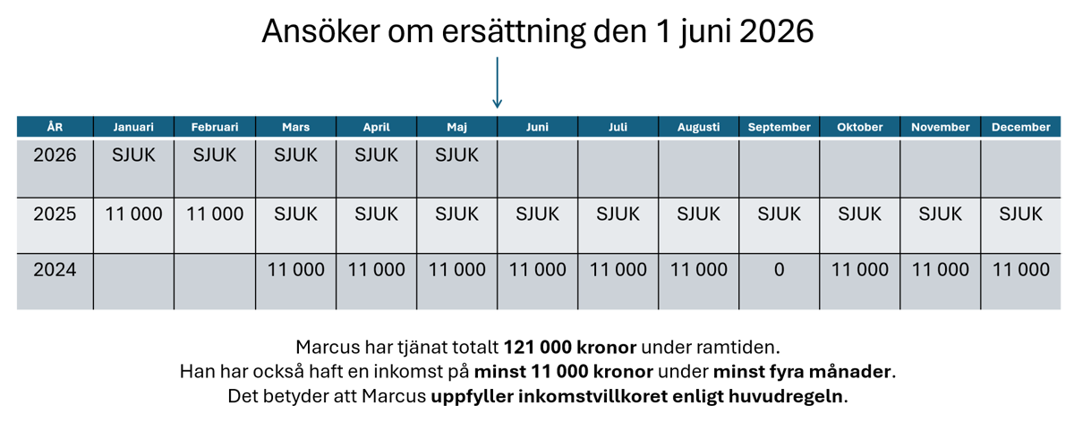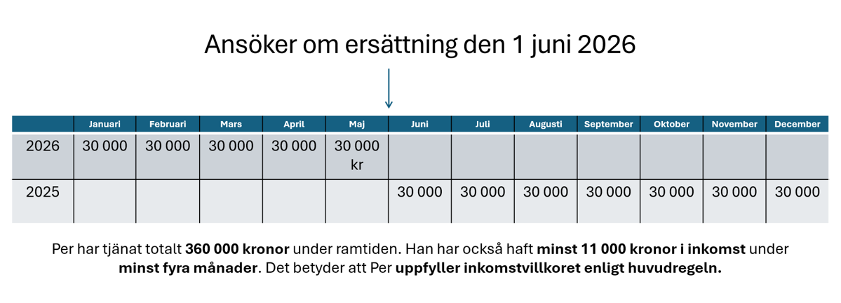 💡 Ramtiden är de 12 månader som ligger före månaden då du ansöker om ersättning. Om du t.ex. ansöker från 1 juni 2026, räknas inkomster från 1 juni 2025 till 31 maj 2026.